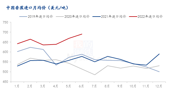 如图所示,2022年6月份香蕉进口均价约为689.64美元/吨,环比上涨3.01%,同比上涨19.48%。越南、菲律宾、印度尼西亚、泰国香蕉价格均有不同程度的上涨,平均环比上涨约18美元/吨。