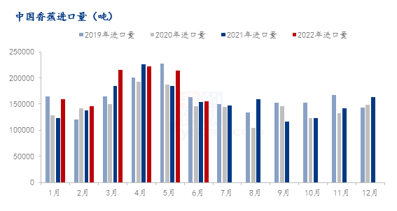 导语:随着气温升高,国内香蕉市场进入消费淡季,2022年6月中国香蕉进口量为15.54万吨,环比减少27.16%。