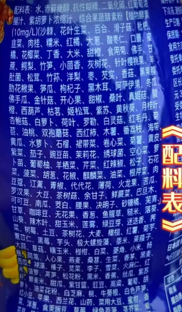 近日,某知名影视艺人在一段视频中向人们展示其买到的一瓶饮料,该饮料配料表上标注有232种配料,其中不仅有红橘、甜橙、猕猴桃等水果及白萝卜、西红柿、黄瓜等蔬菜,还有小茴香、红辣椒、花椒等香料。该饮料的推广文案宣称,“采用日本ISDG品牌核心综合酵素粉”,拥有“每晚入睡更轻松”“提升夜间能量的消耗”等功能。