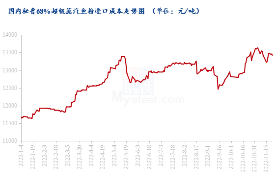 价格方面,今年进口各国的鱼粉均价呈现逐月上升的趋势,截止到2022年10月,进口各国鱼粉均价约11762元/吨,较年初相比上涨2546元/吨,涨幅27.6%。截至11月24日,秘鲁超级鱼粉外盘报价1830美元/吨,按11月24日下午的汇率7.16计算,再加上港口杂费,进口鱼粉到港的成本已经达到了13452.8元/吨-13502.8元/吨。自10月中下旬以来,汇率频繁偏强震荡,秘鲁外盘CNF报价小幅上调,叠加近期秘鲁新季配额推迟公布,以上原因共同提振进口鱼粉价格。截至11月24日,进口秘鲁超级蒸汽鱼粉价格最高涨至14000元/吨,较10月上旬涨幅达到500元/吨,当前秘鲁超级鱼粉市场整体价格在13700元-14000元/吨。