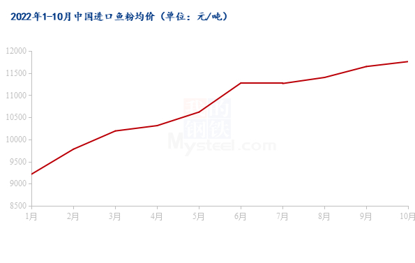 需求方面,据农业农村部畜牧兽医局及中国饲料工业协会样本企业数据显示,2022年10月,全国工业饲料产量2672万吨,环比下降5.7%,同比增长0.2%。主要配合饲料、浓缩饲料产品出厂价格环比小幅增长,如育肥猪配合饲料10月出厂价格为3.84元/公斤,环比增长1.9%,同比增长10.7%;育肥猪浓缩饲料10月出厂价格为5.93元/公斤,环比增长3.1%,同比增长12.5%。饲料价格的上调,主要原因来自饲料原料价格的上调,其中当然包括鱼粉价格的飙升。