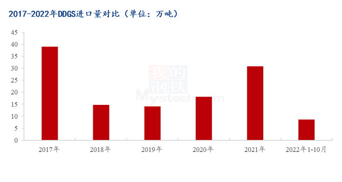 2022年1-10月份DDGS进口量共计8.68万吨,较2021年进口量减少22.09万吨,降幅参考71.79%。其中2022年6-8月份进口DDGS到货量为0吨,随后于9月份开始恢复少量到港,Mysteel预计2022年DDGS年度进口量或不足9万吨。