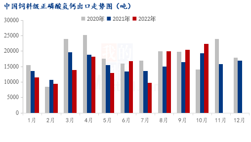 据海关数据统计,2022年10月,我国饲料级正磷酸氢钙出口量约为22355.7吨,环比增幅9.37%;同比增幅15.24%,10月磷酸氢钙出口量再创今年新高,延续增量态势。10月场内企业开工稳定,支撑磷酸氢钙出口量上行,同时国内企业待发订单充足,磷酸氢钙国外需求持续偏强,2022年1-10月,我国饲料级正磷酸氢钙出口量约为155355.7吨,同比降幅0.6%。全年累计出口量环比小降下预计11月份出口量或与10月相差不大。