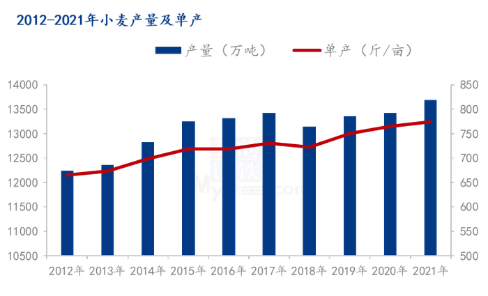 再看一下产量。我国产量近五年来一直呈现稳步递增趋势,这得益于我国对种植结构和种子的不断优化。虽然2018-2020年种植面积呈现下降趋势,但产量方面仍保持上涨,保障了我国粮食安全。2021年在河北、河南、山东部分地区晚播情况下,通过加大播种种子用量等方法干预,并且年后天气适应小麦生产,小麦市场迎来了大丰收,部分地区表示亩产达到1000斤以上。今年小麦播种期间天气适宜,主产区90%以上的地区在正常时间内完成播种,并且今年山东、河南及河北南部等地区普遍表示在小麦生长前期阶段,气温偏高无雨雪天气,小麦涨势良好,为明年丰收打下良好基础。在预计种植面积进一步增加的情况下,明年小麦产量仍将延续上涨态势,产量将会达到13900万吨,涨幅1.5%
