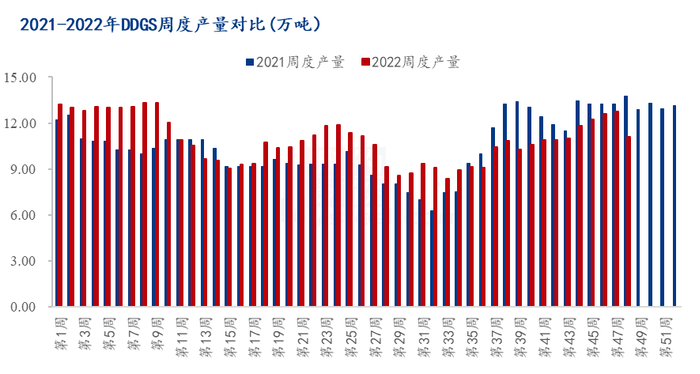 11月中旬至今,DDGS市场价格高位,新单成交持续平淡,玉米酒精企业多数因生产亏损,对其挺价接单,持货商则灵活处理余量,市场不乏小幅降价出货现象。11月26日起,黑龙江、吉林、内蒙古及河南等地部分酒精企业先后发布装置减产、停车计划,DDGS现货供应增量预期被打破,本周产量较上周呈现明显下降。