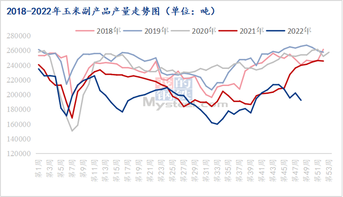 产量来看,据 Mysteel 对全国主要91家玉米深加工企业(含淀粉、氨基酸企业)调查数据显示,2022年11月全国91家样本点玉米副产品总产量为85.8万吨,较9月减少5.58万吨,其中11月份玉米蛋白粉产量18.39万吨,喷浆玉米皮产量42.9万吨,玉米胚芽产量24.51万吨。