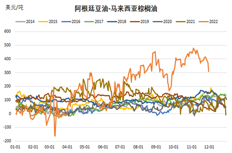 此外,因预期美豆油需求预估下调,美豆油净出口量有望获得相应提高,这将打压当前仍高企的国际豆棕价差,削弱棕榈油出口竞争力,为棕榈油带来间接利空影响。然而,从整体来看,即便同时考虑美豆油产量下滑及净出口增长,2022/23年度的美豆油期末库存也恐将较USDA的11月预估出现上调,这或令美豆油69美分/磅的年度均价进一步下移。