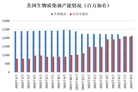此外,EPA还撤销了在特朗普执政时期违规发放的豁免额度,并把全部待定的豁免申请予以了否决。拜登政府的这一系列举措,对可再生燃料产能的扩张形成了巨大的促进作用,美国可再生柴油产能从2021年初的7.91亿加仑快速增加至今年8月的21.34亿加仑,短短一年多的时间里翻了近两番。