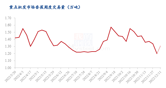 2022年第48周(12月5日-12月11日)全国重点批发市场香蕉周度交易量约为1.20万吨,较上周减少10.14%,预计第49周总量将有所回升。各地新冠疫情反复,市场临时关闭的现象时有发生,国内市场行情持续弱势运行,10月份的香蕉进口量也创下了近几年同期的最低点。12月初各地新冠疫情防控政策陆续放宽,市场行情有望回暖。