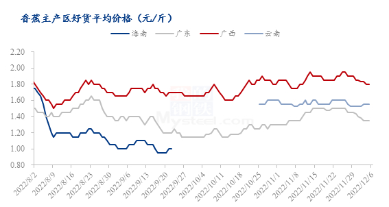 总结:目前国内香蕉产区整体供应较为宽松,随着广西香蕉质量下降,市场上云南香蕉逐渐成为主流。由于香蕉处于消费旺季,防控政策放宽后,市场参与者积极性提高,预计短期内香蕉产区价格震荡偏强运行。受天气、终端需求、市场参与者心态等不确定因素影响,具体还需密切关注后续市场走货情况。