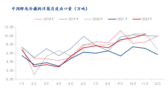 【导语】2022年11月中国鲜或冷藏的洋葱出口量为10.34万吨,同比增加46.09%,下半年出口行情明显好转。国内市场缺乏利好提振,洋葱价格延续弱稳态势。