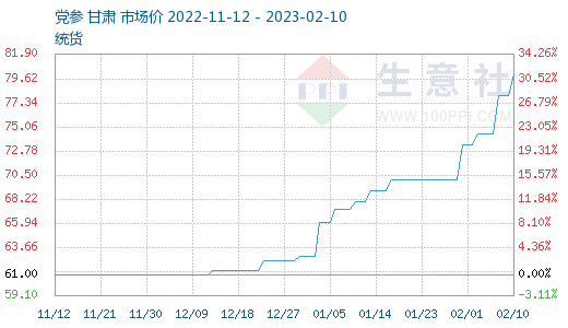 根据生意社价格监测,党参年后行情不断上涨,但由于价格偏高,近日商家暂持观望对待,目前党参统货价格在75-80元/公斤,与年前相比上涨了14.29%。