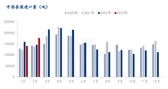 导语:进入2023年之后,随着边境管控政策陆续放宽,进口香蕉行情逐渐回暖。2023年2月,我国香蕉进口量为17.73万吨,环比增加26.33%,同比增加21.35%。