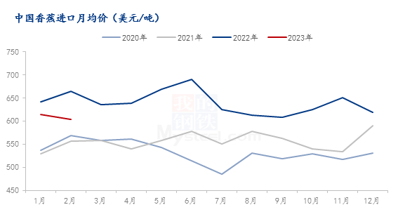 图二 2020-2023年中国香蕉进口月均价对比