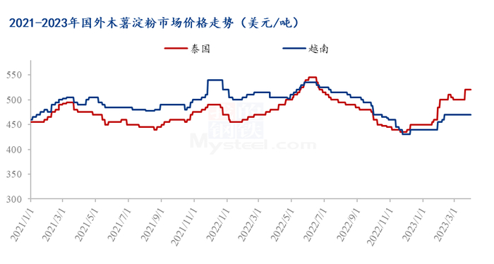 目前,泰国木薯淀粉FOB(曼谷)报价500-540美元/吨;越南木薯淀粉CNF报价460-480美元/吨。从外盘木薯淀粉市场行情来看,泰国原料供应大幅减少,淀粉产量持续回落的状态,受泰铢兑美元有所反弹、原料成本维持高位等因素的综合影响,泰国淀粉的出口行情总体仍维持偏强的走势。越南本榨季的淀粉生产已经进入中后期,越南木薯淀粉产量持续回落。越南木薯淀粉市场价格也是维持在一个相对的高位。目前国外的出口价格整体是稳中偏强的走势。