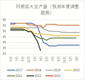 2022/23年度阿根廷因为干旱问题大豆产量持续下调,美国农业部给出3300万吨的产量,同比减产1100万吨。阿根廷减产落地利多基本消化。
