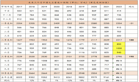 供应端:国内大豆预计4月下旬大量到港:4月850万吨,5月1000万吨,6月940万吨。结构上国内4、5、6月豆子大量到港比较确定。一季度进口大豆供应同比增加200万吨,二季度同比增加200万吨,一二季度累积进口大豆同比增加近400万吨的增量,供应同比大幅过剩。