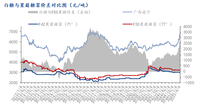 近期白糖价格连续上行, 导致两者价格连续扩大,按照白糖价格6800元/吨计算,本周两者价差在2628元/吨,基本创近五年新高,高价差对于上下游均有一定心态刺激,市场对于替代关注度也在增高。
