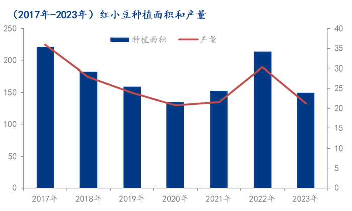 【导语】五一假期已过,春耕将至,2022年红小豆的价格从高位一路下滑,直接影响农户对于新季红小豆的种植意愿。2022年红小豆播种面积为214千公顷,较去年增加61.14千公顷,上涨40%。2022年红小豆产量为30.3万吨,较去年增加8.69万吨,增加40.21%。而红小豆种植收益的不断减少,同时根据产区农资销售、种植合作社等样本调研得出的结论,2023年红小豆的种植面积较2022年减少30%左右。
