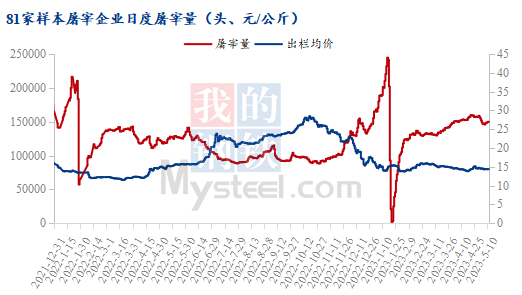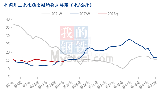 1:生猪方面:据Mysteel农产品数据显示,截止到5月11日全国外三元出栏均价为14.29元/公斤,较昨日下跌0.09元/公斤,最低价云南13.60元/公斤,最高价浙江14.94元/公斤。近日全国猪价持续弱势走跌,因养殖端持续增量和散户认价出栏导致的市场猪多现状,仍为行情底部摩擦的主因,同时猪肉消费淡季也对行情有所拖累,以及短期市场信心不足,加之二次育肥体量仍有限、收储政策光打雷不下雨,短期市场利空因素偏多而涨价动力几无,预计短期行情延续弱势运行,维持低价磨底状态。