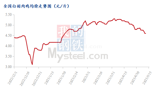 2:肉鸡蛋鸡方面:近期白羽鸡苗价格陡崖式震荡下行,且“五一”过后,已跌破去年同期价格,也就是说市场均价已经低于去年同期,且就当前形式来看,仍有下行趋势;毛鸡价格近几日连续走低,养殖端开始亏损,产品走货难度较大,价格下滑,且毛鸡价格仍有下行趋势。从鸡苗供应量高位、毛鸡出栏量增加,毛鸡价格连续加速走低、终端消费疲软,分割品交投难度大,批发市场交投低迷,产品仍存在下行空间、空棚率低及各个产业链的看空心态等方面综合分析,白羽鸡苗价格仍存下行空间;养殖端出现退计划的操作,价格或有短暂企稳的情况;从供应面看,鸡源逐步上量,价格支撑转化为利空;从需求面看,消费端依旧低迷,看空情绪不减;从替代品角度看,生猪依旧维持底部震荡,对整体的肉类消费持续压制。综合考虑,当前毛鸡市场供增需弱,下行趋势明显,预计短期内毛鸡价格仍以稳中下行为主。