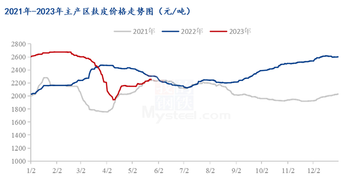 2023年以来,主产区麸皮均价从2675元/吨的高位回落至1942元/吨的低位,4月中旬开始,止跌反涨。截至5月19日主产区麸皮均价2258元/吨,环比4月上涨5.02%,同比去年同期下跌2.0%。一季度麸皮价格受到小麦价格大幅下跌以及饲料需求疲软等方面影响,价格大幅回落;饲料企业需求不振,麸皮刚需拿货为主,麸皮走货清淡。4月中旬开始,小麦价格跌势放缓,企业面粉走货滞缓利润微薄,挺价副产品,且受饲用替代豆粕、玉米等产品价格上涨影响,麸皮价格止跌反涨。劳动节之后,企业开机低位,麸皮供应偏紧,龙头企业麸皮价格小幅上涨,中小企业价格跟涨,麸皮价格维持坚挺。从近期企业走货情况来看,库存消耗略显乏力,价格难以维持坚挺,或有回落的趋势。