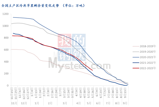 从库存苹果方面来看,截至2023年5月25日,全国主产区库存剩余量为254.66万吨,本月全国冷库出货量123.24万吨,环比上月减少19.94万吨,减幅13.93%,整体来看,五一节日后山东产区交易热度不减,东强西弱态势明显。5月西部产区走货减缓幅度高于山东产区。西部受货源质量下滑拖累,西部交易量放缓,客商多包装自存货源发货物发货为主,月内处清库期冷库走货速度较快。山东产区五一后交易不减,客商多集中于山东产区进行补货,月内价格不断走高,目前栖霞西部果农货乡镇冷库剩余货源集中在85#片红较多,其余可售货源数量不多。