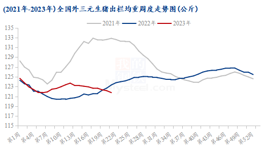 本月全国外三元生猪出栏均重为122.06公斤,较上月下降0.89公斤,环比下降0.73%,同比下降0.56%。本月生猪出栏均重下降,一方面,月内行情持续磨底,生猪出栏价维持在14.00-14.50元/公斤,导致市场信心不足。且春节之后,猪企亏损时间较长,部分企业资金压力大,养殖场压栏、惜售等操作偏少,加速资金回流。而猪价跌至过低水平时,也有阶段性偏小体重、二次育肥猪源出栏情况,拉低了整体出栏均重。另一方面,天气逐步转热,高温天气影响生猪日增重,加大猪群应激效应,且大猪需求明显减量,使得养户养大猪及压栏意愿较低。