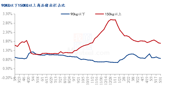 冬季是猪肉消费季节性旺季,更是肥猪消费高峰时期。冬季的腌腊、灌肠,肥猪出肉率高于标猪2%-3%,市场更青睐肥猪。随着腌腊、灌肠的结束,肥猪消费失去有力支撑,肥猪价格优势不在。进入夏季之后,部分屠企拒收大肥猪,肥猪出栏明显下滑。据Mysteel农产品数据显示,截至5月31日,150公斤以上出栏占比1.69%,150公斤以上出栏占比较年初明显下滑。大肥猪失去消费市场,价格自然没有优势,猪企养大猪意愿更差。