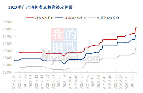 自上周五秘鲁官方公布配额后,此配额数量相比往年处于低位,但也在多数市场人士意料之内。国内鱼粉持货商表示停报观望,重点关注秘鲁捕鱼情况。试捕情况不理想的消息随之而来,以及饲料终端询货成交积极,本周开始鱼粉价格高位上涨,6月8日前市场超级鱼粉报价15500元/吨,而8日宣布停捕后,市场表现不平静,停捕消息引发国内鱼粉市场对秘鲁鱼粉后续补库的担忧。截至发稿前,秘鲁超级鱼粉报价高达16000元/吨,实际成交价达15800元/吨,日本级鱼粉价格15000-15500元/吨,普通级鱼粉价格14100-14500元/吨,本周市场价格环比上周上涨500-600元/吨。