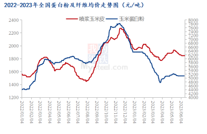 本月深加工企业玉米副产品报价前期持续维持地位运行,供需博弈一直处于紧张阶段,截止到2023年6月19日,山东市场玉米蛋白粉主流成交5160-5280元/吨,喷浆玉米纤维主流成交1750-1800元/吨;黑龙江市场玉米蛋白粉主流成交5100-5160元/吨;喷浆玉米纤维主流成交1750-1850元/吨。目前蛋白粉及纤维价格本周已有上调,近期市场心态有被豆粕行情鼓动起来,下游买涨不买跌的情绪渐显,前期尘封已久的市场在近日有所恢复。