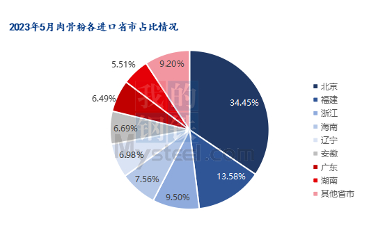 2023年5月份肉骨粉主要进口省市为北京、福建、浙江、海南、辽宁、安徽等地区,占总进口量的78.76%。北京市进口占比最大,进口数量为4989.918吨,其进口数量占总进口数量的34.45%;福建省进口数量占总进口数量的13.58%,浙江省进口数量占总进口数的9.5%,海南省进口数量占总进口数量的7.56%。