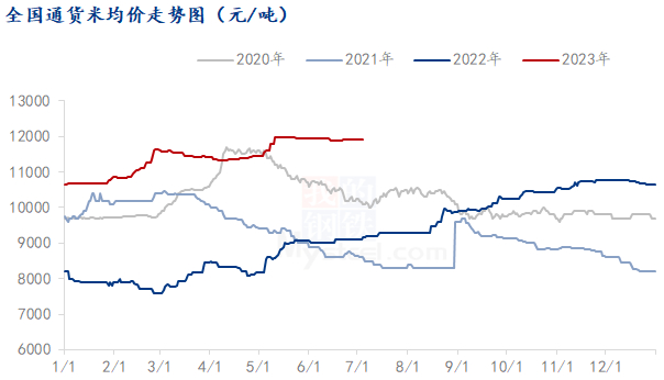 2023年上半年花生价格高开高走,整体呈现偏强态势。截止至2023年7月7日,全国通货米均价为11920元/吨,较年初上涨1260元/吨,涨幅11.81%。与去年同期相比较上涨2770元/吨,涨幅30.27%。2022季花生中植时期主产区天气干旱,导致花生种植时间推移;加之去年农户整体收益较差,种植意愿明显降低,部分产区选择改种花生,供需矛盾下花生价格持续攀升。下半年花生将迎来新季花生上市,天气的变化、国内种植面积的增减、新季花生的产量以及市场需求的变动将继续成为我们关注的重点。