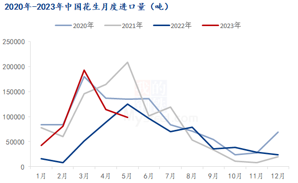 从中国花生进口量来看,国内花生价格走强,油厂以及贸易商采购进口花生意愿增加。截止至2023年5月,进口花生总量为529331.153吨,与去年同期相比增加239112.9吨,增幅为82.39%。