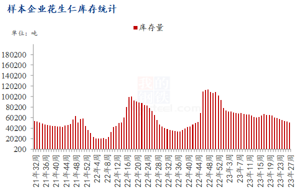 从样本企业库存方面来看,根据Mysteel数据统计,截止至2023年7月,全国样本企业花生库存总量为51276吨,环比减少8475吨,降幅14.18%;同比下降8.46%。2022季新花生上市后,油厂收购意愿强烈,但由于国内花生价格较高且集中供应量不足,油厂库存稳中有增。主力油厂陆续开机压榨,库存量保持平稳下滑态势,多处于安全库存内。11月样本企业库存量达到113760吨,同比增长50%。值得注意的是,2022季油厂开机率与去年相比相差甚远,开机率的走低导致油厂库存维持在相对高位。