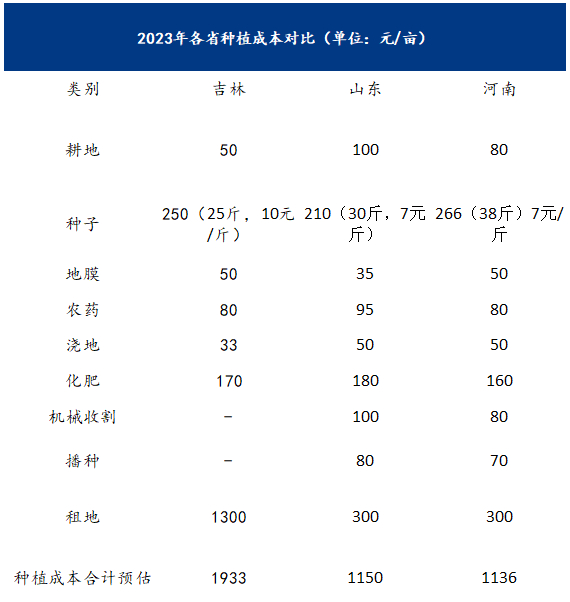 2.吉林产区浇地成本相对较低,主要原因是当地多采用井水灌溉,成本多为水泵产生的电费,其他产区为直接灌溉,浇地费用高于吉林。