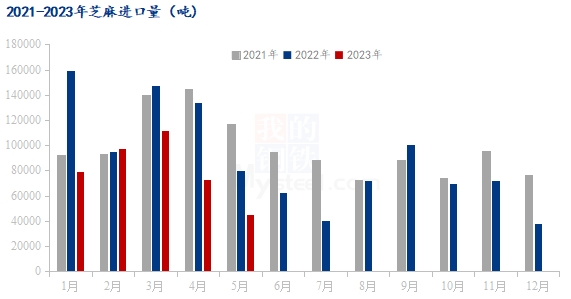 从海关数据(2023年1月-5月)来看,上半年国内芝麻进口量为406397.45吨,较去年615618.23吨减少209220.78吨,跌幅33.99%,进口国家主要以尼日尔、苏丹、多哥、埃塞俄比亚等非洲国家为主,其中在尼日尔进口140860.225吨,占比34.66%,在苏丹进口93090.711吨,占比22.91%,从多哥进口78390.031吨,占比19.29%,早埃塞俄比亚进口24199.058吨,占比5.95%。上半年进口受国内需求、汇率、外盘等原因影响下,贸易商进口成本增加,一定程度上降低了贸易商的备货积极性。从进口均价来看,本年度上半年进口芝麻均价为1584.76美元/吨,较去年1493.16美元/吨相比上涨91.61美元/吨,涨幅为6.14%,年后归来,外盘报价上涨800-1000元/吨,进口成本增加,因此进口芝麻均价有所增加。