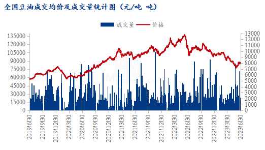 据Mysteel农产品调研显示,2023年1-6月全国重点油厂豆油散油成交总量约为248.93万吨,同比减少约8.045万吨,减幅约3.13%。日均成交量约为2.02万吨,同比去年2.11万吨减少约0.09万吨,减幅约4.27%。现阶段终端需求依然表现不佳,部分企业对远月比较有信心,会部分建仓,表观消费尚可。
