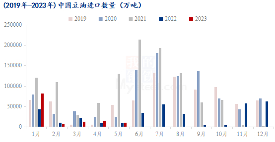 据中国海关数据显示:2023年5月国内豆油进口量10185.469吨,较今年4月份14810.269 吨减少4624.8吨,环比减幅31.23%。截至2023年1-5月国内豆油进口累计125740.733吨,较去年同期93971.686吨增加31769.047吨,增幅33.81%。对比近5年数据,2023年上半年除了1月份进口量相对较高,其余月份都保持近5年相对低位。