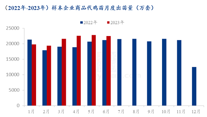 而上半年商品苗供应量最高月份是5月份,一方面,由于前期父母代换羽种鸡多数已进入产蛋高峰期;叠加受前期商品苗价格持续高位运行,市场老周龄种鸡出现延淘现象;另一方面,父母代新开产种鸡产蛋逐步处于上量阶段,且仍新开产种鸡仍有增量;多方致使商品苗供应量增加。