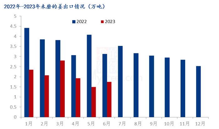 【导语】据海关数据统计显示,2023年未磨的姜6月出口量同比增加,环比稍有增加,出口均价环比有所下调,但整体降幅不大。