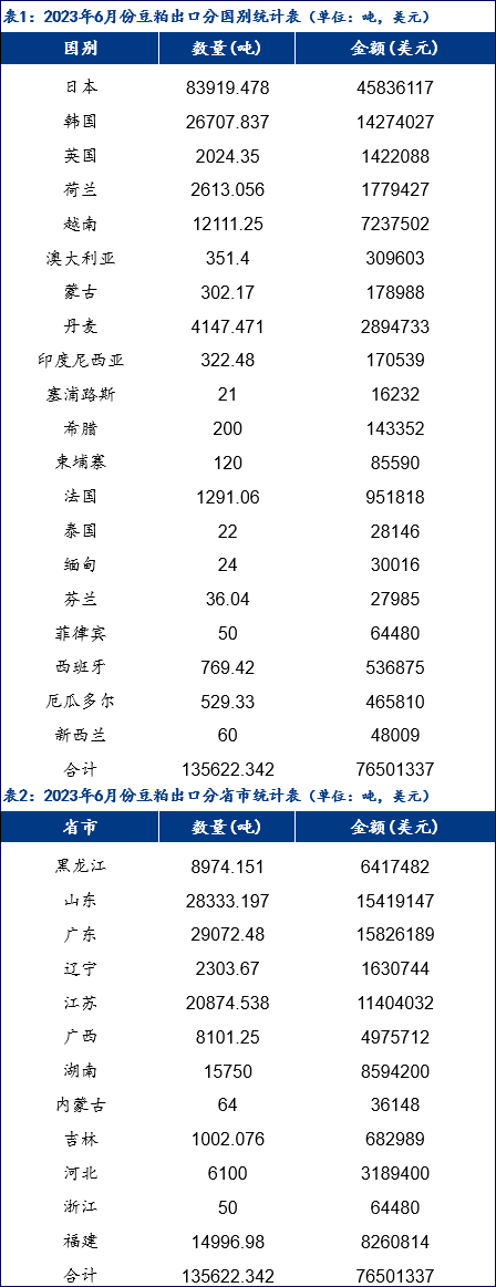 2023年6月,我国出口豆粕主要省份为广东、山东、江苏等12个省自治区。其中广东出口豆粕29072.48吨,占比21%;山东出口豆粕28333.197吨,占比21%;江苏出口豆粕20874.538吨,占比15%。