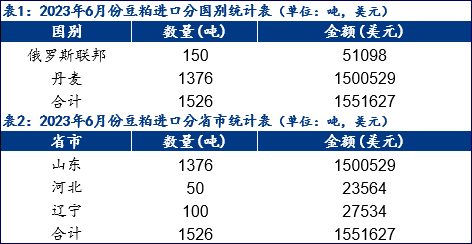 具体分区域来看,中国6月豆粕进口来源国家为丹麦、俄罗斯两国,其中6月从丹麦进口豆粕1376吨,占比90%;从俄罗斯进口豆粕150吨,占比10%。