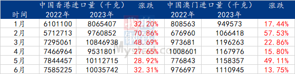 2023年上半年鲜鸡蛋出口流向地区仍是集中于中国香港及中国澳门,其中中国香港占比达90%左右,中国澳门占比10%左右。从两地进口量数据上可以看出,同比2022年上半年各月份均处于增涨态势,其中2月份同比增涨最大,中国香港增幅达70.86%,中国澳门增幅达57.53%。