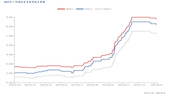 8月3日秘鲁官方宣布试捕后进口鱼粉价格开始下调,以广州市场价格为例,秘鲁超级鱼粉主流成交价为18700-18900元/吨,秘鲁日本级鱼粉主流成交价为18200-18300元/吨,秘鲁普通级鱼粉主流成交价为17200-17300元/吨,整体较之前下调100-200元/吨。鱼粉需求缺乏动力支撑,终端对之前高价接受度较差,目前无明显采购备货计划,鱼粉暂无准确的利好消息出现,鱼粉价格难以提振。