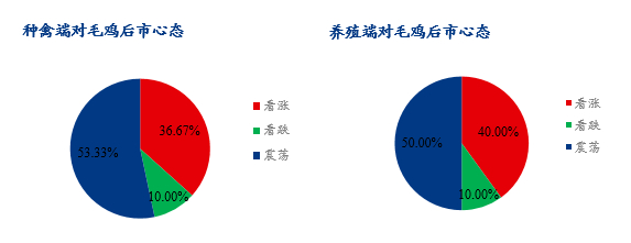 本周Mysteel农产品共对50家企业进行了市场心态调研,这50家企业中有10家是孵化端,10家是养殖端,25家是屠宰端,5家是贸易端。看涨12家,看跌18家,看稳20家。