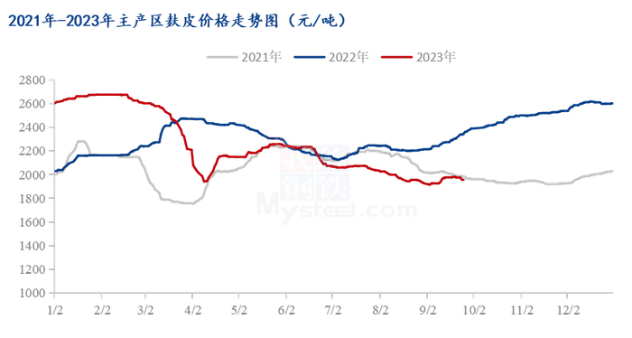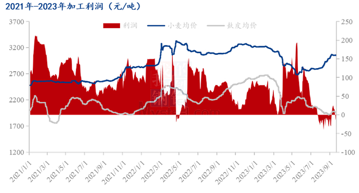 从制粉企业方面来看,9-10月份面粉需求疲软,企业开机维持低位,叠加天气逐步转凉,麸皮便于存储,粉企库存压力不至于不大。其次小麦价格维持震荡调整,涨跌皆受限,企业利润难改颓势,因此麸皮价格短期内虽会弱势调整,但并不会持续,毕竟有原粮成本作为支撑。