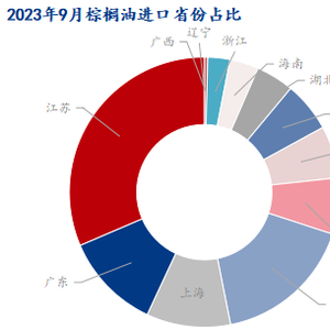2023年9月份中国棕榈油主要进口国为印度尼西亚、马来西亚、菲律宾,主要进口省份从多到少依次为江苏省、天津市、广东省、上海市及四川省。其中我国从印度尼西亚进口棕榈油(棕榈液油+棕榈硬脂)67.63万吨,进口占比83.08%;从马来西亚进口棕榈油11.41万吨,进口占比16.88%;从菲律宾进口棕榈油243吨,进口占比0.04%。