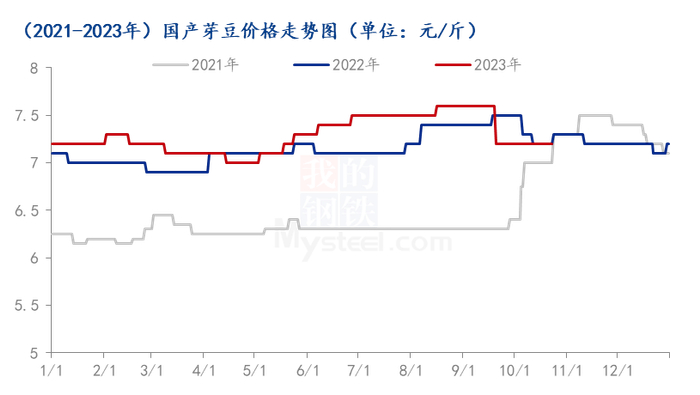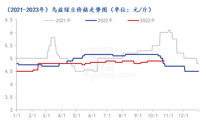 我国芽豆品类众多,市场主要认可乌兹别克斯坦货源。因此,每年乌兹绿豆的大量上市直接影响我国芽豆价格波动,2023年乌兹绿豆价格波动幅度较小。截至10月30日,乌兹芽豆出货价格4.9元/斤,较9月初上涨0.1元/斤。新季乌兹绿豆种植面积较去年减产30%以上,目前均已陆续收割完成,主产区分布在塔什干和撒马尔罕这两大产区。但今年受干旱影响较大,当地水渠水量不足,预估乌兹新季绿豆产量在7-8万吨。