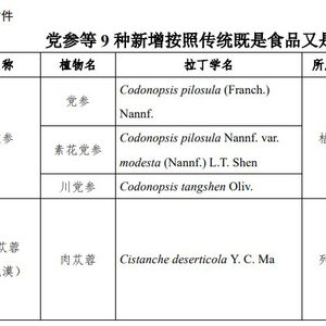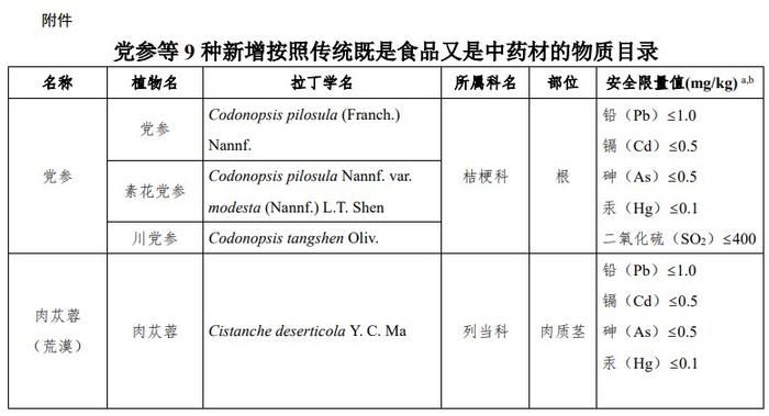 根据《食品安全法》及其实施条例、《按照传统既是食品又是中药材的物质目录管理规定》,经安全性评估及试点生产经营,现将党参、肉苁蓉(荒漠)、铁皮石斛、西洋参、黄芪、灵芝、山茱萸、天麻、杜仲叶等9种物质纳入按照传统既是食品又是中药材的物质目录。